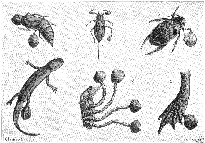 M. Kew cite cinq exemples de Nèpes, larges coléoptères [Hémiptères] bien connus, aux pattes desquels on trouva des Sphaerium ou des Pisidium (fig. 2). Des exemples semblables ont été rapportés par Darwin, à l'occasion d'un Dytique capturé par M. Crick de Northampton, et qui transportait aussi, cramponné à l'une de ses pattes, un Sphaerium corneum (fig. 3).