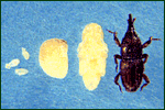 Larve : 2,5 à 3 mm, blanche à tête brun clair, très