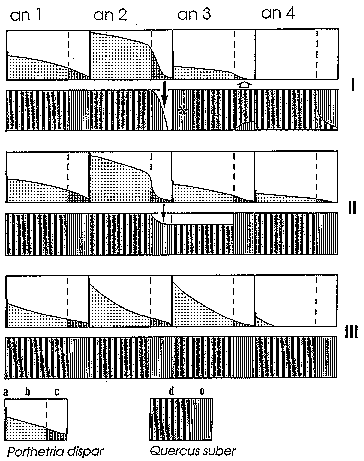 Since 1991 supervision over the main experimental setup has been stopped. Further wide scale investigations would probably be of little value anyway, because cork oak stands grow older and are not regenerated. Forest health worsens with illegal cork oak stripping and cutting and with increasing damage by xylophagous organisms: the fungus Diplodia mutila (Fri.) Mont. (Coelomycetes) (Bakry et al., 1999) and coleopteran insects including Cerambyx cerdo L. (Cerambycidae) and Platypus cylindrus (Platypodidae) (Villemant & Fraval, 1993; El Antry, 1999). Therefore, conditions affecting gypsy moth populations will probably differ considerably from those already observed.