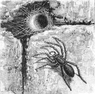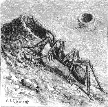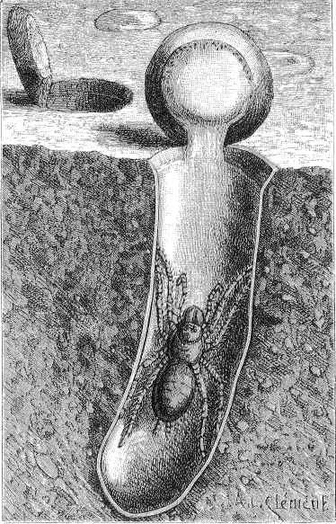 Parmi les autres araignées terrestres, nous citerons la Mygale pionnière, dont les pattes sont conformées de manière les unes à fouir et les autres à filer. Elles creusent un puits dont la profondeur varie de quelques centimètres à 2 ou 3 décimètres, d'un diamètre proportionné à la grosseur de l'animal. Les parois sont d'abord consolidées et unies, puis revêtues d'une tenture de soie blanche et brillante, plus ou moins épaisse, adhérant fortement. L'ouverture est fermée à l'aide d'un couvercle de terre, tapissé de soie sur la face inférieure ; elle est légèrement évasée en entonnoir et le couvercle est taillé en biseau de manière à s'y adapter exactement. Une charnière en soie élastique et résistante permet à l'animal de soulever le couvercle, comme une porte qui tourne sur ses gonds (fig. 4). Le dessus du couvercle est parsemé de petites pierres qui ne permettent pas de le distinguer aisément du sol environnant lorsqu'il est abaissé. Il est tronqué à l'endroit où se trouve la charnière. Enfin, on remarque sur la partie du bord opposée à la charnière de nombreux petits trous, dans lesquels l'animal engage ses griffes, s'accroche ainsi et s'arc-boute à la paroi pour maintenir le couvercle fermé hermétiquement lorsqu'il est chez lui et qu'un ennemi cherche à pénétrer dans sa demeure. Certaines font des puits courbes à deux ouvertures ; d'autres les font bifurquer à l'intérieur et varient les formes et les dimensions des diverses parties ; elles établissent des couvercles aux points de bifurcation et ont ainsi un appartement composé de plusieurs pièces indépendantes ; d'autres enfin construisent des souterrains plus ou moins contournés et irréguliers. Il en est une en Afrique qui garnit son terrier d'un tube de soie blanche, lequel se prolonge de 10 à 15 centimètres au-dessus du sol, s'évase légèrement et se trouve maintenu verticalement par des herbes. D'autres, du même pays, prolongent leur terrier hors du sol, à une hauteur variable selon les espèces et qui peut atteindre 10 centimètres, avec ou sans couvercle. Ce tuyau extérieur, formé d'un tissu solide et résistant, est recouvert de débris de feuilles et de terre.