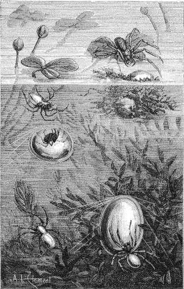 Un mot pour terminer sur l'araignée aquatique (argyronète). Grise ou brune, velue, on la voit plonger, nager dans l'eau, gagner la surface, puis replonger, lorsqu'elle construit son nid. Observez-la : la voici près de la surface, la tête en bas, ne laissant affleurer que l'extrémité postérieure de son abdomen. Elle croise alors rapidement. les pattes voisines au-dessus de son corps. Tout autour de la partie qui affleure se forme une légère dépression et l'air qui s'y trouve est emprisonné par les poils. Elle en est enveloppée pour ainsi dire, ce qui lui donne des reflets brillants et argentés quand elle est plongée dans l'eau. Elle plonge alors et, avec ses pattes, elle rassemble l'air qui la recouvre en une bulle unique qu'elle dépose sous quelques légers fils ou qu'elle fixe à des brins d'herbe. Cela fait, elle remonte à la surface, recommence le même manège, et, il chaque nouveau plongeon, augmente sa provision d'air. La bulle est bientôt visible. Lorsqu'elle est de la grandeur d'une petite bille, elle jette au-dessus des fils dont l'éclat argentin a fait donner à l'araignée le nom d'argyronète, c'est-à-dire qui file de l'argent. Elle passe et repasse, entre-croisant ses fils, et les fixant, par leurs extrémités, aux plantes voisines. La cloche, de forme ovoïde, se trouve ainsi maintenue en suspension dans l'eau. Elle est environ dix fois plus grande que l'animal. On la figure ordinairement transparente, mais c'est qu'alors elle n'est pas terminée. Quand elle est achevée, elle est opaque comme un cocon de ver à soie. C'est dans cet abri aérien, sorte de cloche à plongeur, que notre araignée s'enferme, épiant au passage les petits êtres aquatiques dont elle fait sa nourriture et qu'elle vient ensuite y dévorer. Notre figure 5 donne l'aspect des argyronètes aquatiques. La première, à la surface, est dans l'attitude de la marche ; la deuxième est en train de nager ; la troisième est au repos sous sa bulle d'air. La dernière à droite est en partie engagée dans sa cloche par l'ouverture qui se trouve à la partie inférieure ; près de la surface est une cloche dans une touffe de plantes.