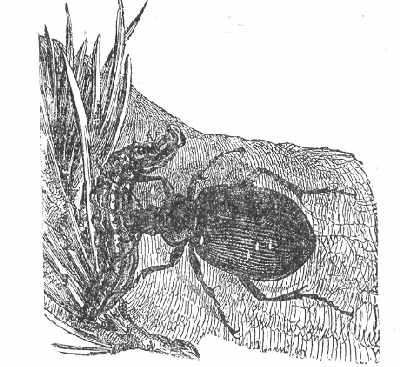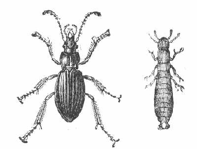 La plupart des Carabides (voir page 5). - Dans les jardins, les larves et les adultes de ces espèces rendent de très grands services ; non seulement on ne doit pas les écraser, mais il est bon de les y pporter et de leur laisser de petits tas de pierres, placés le long des murs, pour les abriter pendant le jour. Comme exemples de Carabides utiles on peut citer, parmi les plus grosses espèces :