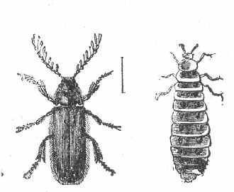 Les Vers luisants (Lampyrides) [fig. 146]. - Les larves et les adultes sont carnassiers et utiles. Ils mangent surtout des Limaces, des Escargots et des Chenilles. Les mâles seuls acquièrent des ailes et peuvent voler, tandis que les femelles restent toujours larviformes. On peut donc recueillir les larves et les femelles et les placer dans les jardins, où elles resteront. Une espèce de cette famille vit d'Escargots; c'est :