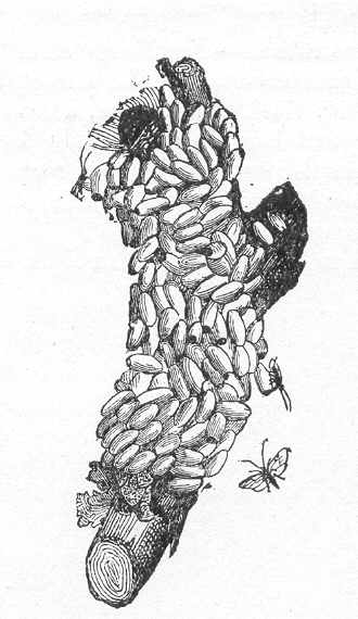 Fig. 152 - Microgaster des bois. Adulte et cocons de la nymphe placés sur le cadavre de la Chenille que les larves ont mangée.