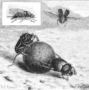 Scarabées (Ateuchus laticollis = Scarabaeus puncticollis), roulant leur boule et portant des Limosina sacra, dont l'une d'elles est figurée, grosssie, en cartouche.