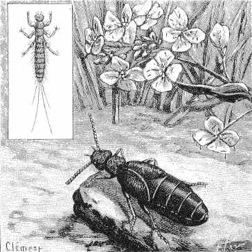 Mais si la place est visitée par un insecte, les larves se jettent sur lui et se cramponnent à sa toison. C'est ainsi que l'on peut en récolter sur un grand nombre d'espèces d'insectes, où elles restent attachées dans l'immobilité la plus complète. Beaucoup de ces larves sont vouées à une mort certaine, et c'est ce qui explique la richesse de la ponte. Les seules qui arrivent à bon port, et peuvent se développer ultérieurement, sont celles que le hasard - car leur instinct n'estl pas parfait - a amenées à se cramponner aux abeilles du genre Anthophore, lesquelles creusent dans le sol des godets souterrains remplis de miel et contenant un oeuf flottant. Lorsque l'Anthophore arrive à son nid, la larve de la Méloé - on l'appelle le Triongulin - quitte rapidement son hôte ou plutôt se glisse sur l'oeuf au moment même ont il sort du corps de la mère. Voilà le Triongulin enfin arrivé à destination ! Il s'empresse de dévorer l'oeuf qui lui sert de radeau: puis s'attaque au miel et,finalement, par une suite compliquée de métamorphoses, se transforme en un Méloé adulte.