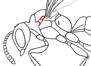 Pronotum avec un lobe latéral bien développé n'atteignant pas la tégula (l'espace les séparant est rarement très étroit) |
