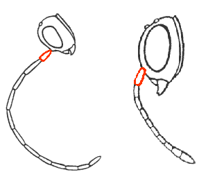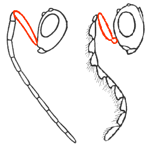 Antenne généralement coudée entre scape et pédicelle; scape généralement bien plus long que le pédicelle |