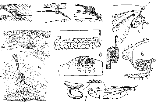 Couplage alaire. 1. Type jugate (Hepialus) ; 2. Type frenate (Plusia), mâle et femelle ; 3. Accrochage au pseudo-balancier (mâle de Margarodidae) ; 4. Coaptation chez les Psoques, a, stigmapophyse, a', crochet du nodulus correspondant ; 5. Appareil d'accrochage et coupe transversale chez un Puceron (Drepanosiphum) ; 6. Coupe transversale du système d'accrochage chez un Cercopide (Tomaspis) ; 7. Aile postérieure d'une Guêpe (Vespa) montrant l'éapissisement du bord supérieur avec les hamules.