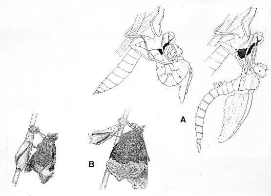 Mue imaginale : A. Éclosion d'un Odonate (Aeshna), B. Éclosion d'un Lépidoptère (Aglais)