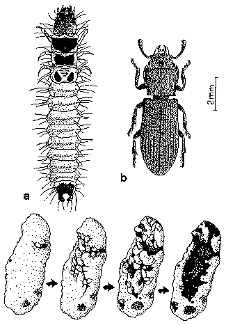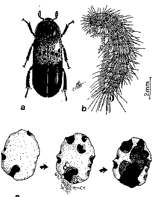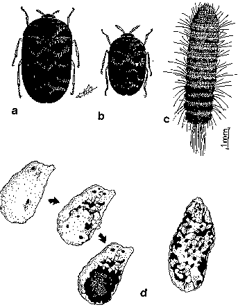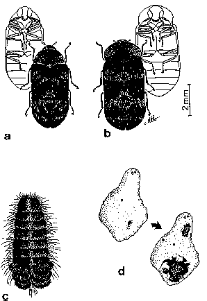a: Anthrenus sp., forme rousse (Taza); b: id., forme noire