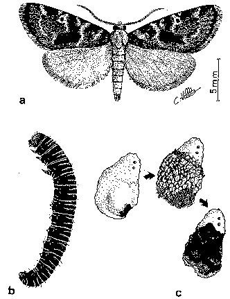 a: papillon; b: chenille âgée; c: dégâts.
