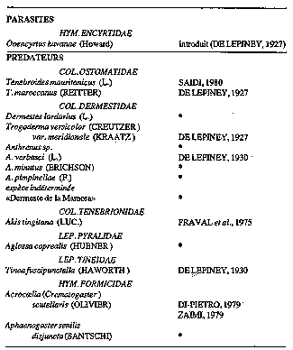 La diversité du complexe des antagonistes de L. dispar au Maroc ne fait que s'accroître au cours des années. Ainsi, depuis DE LEPINEY (1930) le nombre des Dermestides oophages est passé de 3 à 7 espèces, T. mauritanicus n'est devenue réellement abondante que dans les années 80 et le dernier "nouveau prédateur" en date est la Pyrale A. caprealis. Cet enrichissement progressif -et naturel- de la faune antagoniste de L. dispar est à relier au caractère récent de l'introduction du défoliateur au Maroc (GOLDSCHMIDT, 1934; HERARD et FRAVAL, 1980), attesté notamment par la très remarquable absence de tout parasite oophage autochtone.