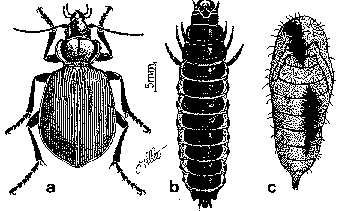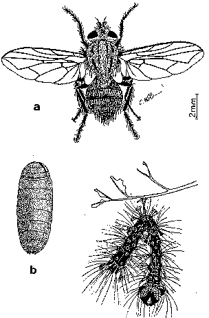 a: adulte; b: pupe; c: chenille de Lymantria dispar parasitée.