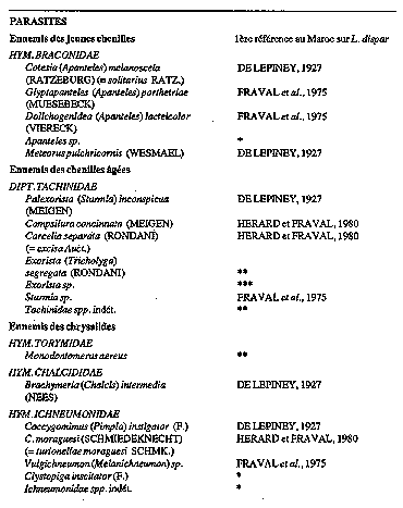 Le complexe des ennemis des chenilles et des chrysalides est proche, dans sa composition spécifique, de celui des autres pays d'Afrique du Nord (RABASSE et BABAULT, 1975; HAMRA-KROUA, 1986). Mais il diffère de celui connu dans les pays européens voisins par le petit nombre des espèces et leur impact global généralement faible (HERARD et FRAVAL, 1980). Cette faible diversité spécifique est liée au caractère récent de l'introduction de L. dispar au Maroc (GOLDSCHMIDT, 1934; FRAVAL, 1986b). Parmi les insectes parasitoïdes absents citons le Braconide grégaire Glyptapanteles liparidis (BOUCHE) signalé en Espagne et en France et les Tachinaires oligophages Blepharipa pratensis (MEIGEN) (= scutellata R.D.) et Parasetigena silvestris (= agilis Auct.) présentes dans ces deux pays comme en Italie (ROMANYK, 1973; DREA, 1978; LUCIANO et PROTA, 1982). Dans beaucoup de pays méditerranéens,les pullulations sont aussi fréquemment jugulées par des épozooties diverses dues à des protozoaires, des bactéries ou des virus (ROMANYK, 1966; CABRAL, 1977; LUCIANO et PROTA, 1985; FUESTER et al., 1983; VASILSEVIC et INJAC, 1984), notamment le Baculovirus de L. dispar, agent de la polyédrose nucléaire (NPV) dont l'introduction en 1978 au Maroc par FRAVAL et al. (1981a) n'a pas été suivie semble-t-il d'acclimatation (FRAVAL, 1986b). Les seules maladies signalées en Maroc, une "grasserie" (DE LEPINEY, 1930), une "virose" et des attaques du champignon Beauveria sp. sur les chrysalides (DI-PIETRO, 1979b) sont toujours demeurées très localisées, n'affectant qu'un petit nombre d'individus (FRAVAL, loc. cit.).