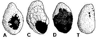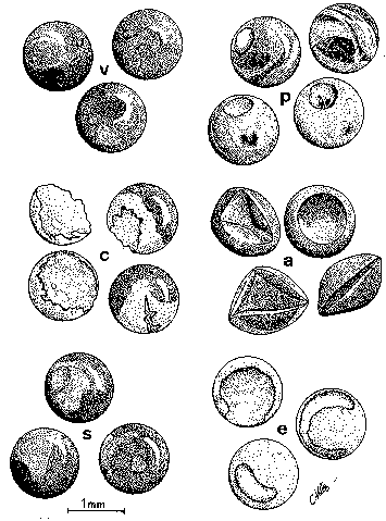 Le tri très précis des oeufs, préalablement débarrassés des poils qui les entourent, est fait sous la loupe binoculaire par un observateur entraîné. Les oeufs viables (une fois le développement embryonnaire achevé) apparaissent pleins et turgescents. Parmi les oeufs non viables, on distingue plusieurs catégories, correspondant grosso-modo à des causes de mortalité (fig. 39).