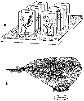 Transposé en forêt, pour des études in situ, ce type d'élevage se fait en cages-manchons, installées dans les arbres. Elles sont constituées d'un "beurrier" (boîte en matière plastique transparente emboîtable, de 25 X 12 X 18 cm) percé, le couvercle servant de porte, (SAIDI, 1981) ou d'un cylindre de toile de bronze (HERARD, non èpubl.) ou de toile de mousseline munis de coulisseaux à chaque extrémité et d'une ouverture latérale (DAHOU, 1984) (cf. fig. 40).