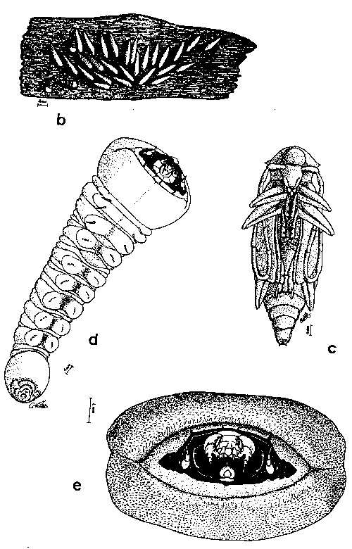 a : imago; b:oeufs (ponte) et larves nouveau-nées; c: nymphe;