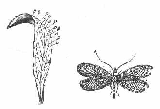 Fig. 152 - Microgaster des bois. Adulte et cocons de la nymphe placés sur le cadavre de la Chenille que les larves ont mangée.