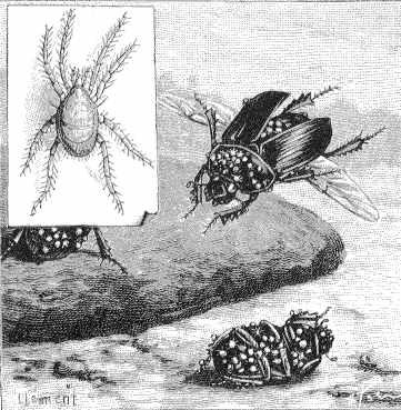 Géotrupes (Geotrupes mulator) portant des gamases, dont l'un d'eux est figuré en cartouche.