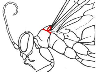 Pronotum avec un lobe latéral bien développé n'atteignant pas la tégula (l'espace les séparant est rarement très étroit) |
