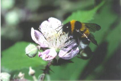 Bourdon (mâle de Bombus lucorum ?) sur fleur de ronces en Île-de-France ( juillet 2001).
