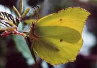 Le Citron (Gonepteryx rhamni), ici un mâle au repos dont on devine l'abdomen par transparence, est un des premiers papillons que l'on voit voler au printemps. Ailes repliées, il se fond à son environnement et passe ainsi discrètement l'hiver dans nos forêts.