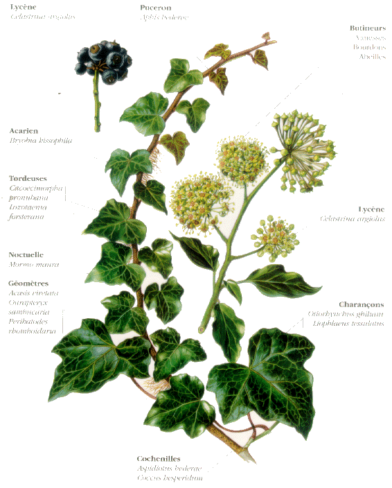 On pourra trouver un Otiorhynque de grande taille (14 mm), Otiorhynchus ghiliani de couleur sombre dont les téguments sont couverts dune courte pubescence gris roussâtre et dont les élytres sont prolongés en courte pointe à leur extrémité. Ce charançon est fréquent sur le Lierre en Provence. La nuit, il découpe très irrégulièrement le bord des feuilles, mais on connaît très mal sa biologie. Un second charançon à museau, Liophlaeus tessulatus, de forme ovale, présente un revêtement dorsal de squamules qui donne à cette espèce un aspect très particulier, comme celui des tuiles dun toit, ce qui lui a valu le nom de tessulatus. Ladulte est nocturne et printanier, il entame le bord des jeunes feuilles pour sen nourrir. Curieusement, la larve consomme les racines de la Grande Berce, Heracleum sphondylium, et probablement celles dautres Ombellifères. Un troisième charançon, lui aussi méridional, de petite taille (3 à 4 mm), de couleur noir mat, appartient à la tribu des Calandrinés : cest Dryophtorus corticalis, qui se rencontre fréquemment dans les galeries de la Fourmi noire des bois, Dendrolasius fuliginosus, fourmi corticole du groupe des Lasius qui élèvent des pucerons. Ce mode de vie nimplique pas nécessairement des habitudes myrmécophiles, mais un simple commensalisme accidentel résultant de lenvahissement par ce type de fourmi dun habitat favorable à un même régime alimentaire ; en effet la larve de ce charançon se développe dans le bois carié du Lierre et de quelques arbres : Pin, Chêne, Saule. De son côté, Dendrolasius fuliginosus construit de toutes pièces, dans de vieux arbres creux et à laide de particules de bois tombées en poussière mélangées à sa salive, des cloisons entrecroisées lui permettant délever des pucerons de grosse taille comme les Lachnus longirostris qui se développent en pompant la sève des parties de laubier encore vivantes. Comme la floraison automnale et préhivernale du Lierre est abondante et tardive, cette plante constitue aussi une aubaine pour les derniers butineurs encore en activité : Vanesses qui sapprêtent à hiverner, Abeilles et Bourdons.