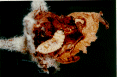 Polyphages, les chenilles portent dorsalement des touffes de poils caducs et urticants. Au printemps, elles reprennent et poursuivent leur croissance. Leur nymphose dans un cocon tissé entre les feuilles se produit fin juin. Les papillons pondent leurs ufs groupés au mois d'août sur les feuilles. La ponte est revêtue par les femelles des poils bruns de l'extrémité de leur abdomen. L'Hyponomeute, Yponomeuta malinellus (+), est une Teigne dont les chenilles vivent en colonie, abritées dans des toiles soyeuses réunissant les pousses qu'ils dévorent. Les oeufs, disposés en ooplaques de 20 à 60 unités sur les petits rameaux, éclosent en automne mais les chenilles restent en diapause sous la coque commune qui recouvre l'ensemble de la ponte. Elles ne quittent cet abri qu'en avril. Vivant en mineuses de feuilles durant le premier stade, elles sortent et commencent ensuite la confection de leur toile collective. La nymphose a lieu sur place dans des cocons de soie blanche. Les papillons volent la nuit en juillet. Parmi les Tordeuses, la plus célèbre est le Carpocapse des pommes et des poires, Cydia pomonella (+), dont la chenille creuse ses galeries à l'intérieur des fruits, ce qui les abîme et provoque précocement une fausse maturité. Le papillon est très reconnaissable par ses ailes antérieures gris-brun presque uniforme avec une tache apicale appelée " speculum ". Le Carpocapse a, selon la latitude, une, deux ou trois générations annuelles. La femelle pond ses ufs sur les fruits ou les feuilles. Sa croissance terminée, la chenille sort du fruit, descend au sol et tisse un cocon soyeux sous un lambeau d'écorce. Toutes les chenilles qui terminent leur développement au-delà du 10 août entrent en diapause jusqu'au mois de janvier. La nymphose et la sortie des papillons seront fonction d'une certaine " somme de températures quotidiennes cumulées " supérieures à 10°C, et nécessaire à la nymphose. Parmi les cinq ou six espèces de " mineuses des feuilles " qui sont des microlépidoptères, on peut citer Leucoptera malifoliella (+), qui a deux, parfois trois générations annuelles. La mine se présente en une spirale dense tournant sur elle-même, ce qui lui donne l'aspect d'un hamac, suspendu sous une feuille. Dans la cavité oculaire du fruit ou sous les écorces.