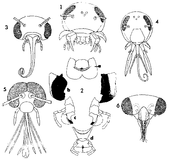 1. Broyeur ; 2. Les diverses pièces buccales : a, labre ; b, mandibules ; c, maxilles ; d, labium ; 3. Lécheur-suceur ; 4. Broyeur-lécheur ; piqueur-suceur (Diptères) ; 6. Piqueur-suceur (Hémiptères).