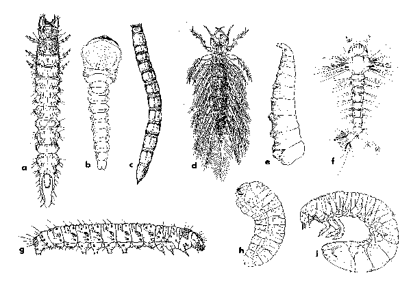 a : Coléoptère Carabidé ; b: Coléoptère Buprestidé ; c : Coléoptère Élatéridé ; d : Mégaloptère Sialidé ; e : Diptère Muscidé ; f : Diptère Culicidé ; g : Lépidoptère Tortricidé ; h : Coléoptère Scolytidé ; i : Coléoptère Scarabéidé.