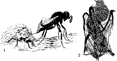 1. L'Hyménoptère Aphelinus mali introduisant son oeuf dans un Puceron lanigère ; 2 : Polyembryonie : une chenille de Noctuelle, Autographa gamma, victime de l'Hyménoptère Litomstix truncatellus, n'ayant pu achever sa nymphose.