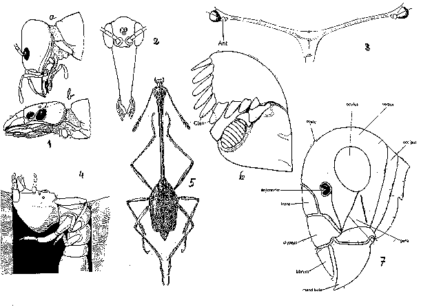 1 : a) orthognathe ; b) prognathe. 2. Panorpe. 3. Diptère Diopsidé. 4. Larve de Cicindèle. 5. Scaphiide, Diatellum. 6. Siphonaptère et cténidies. 7. Tête et appendices.