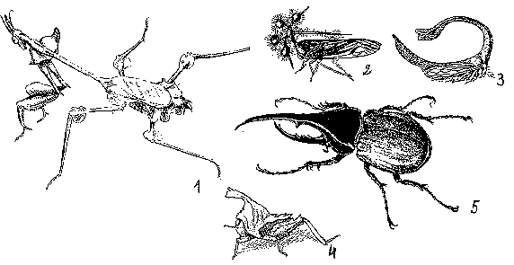 1. Dictyoptères Mantodea (Gongylus) ; 2. Hemiptères Membracidés (Bocydium) ; 3. Hemiptères Membracidés (Spongophorus); 4. Orthoptères Tetrigidés ; 5. Coleoptères Scarabaeidés (Dynastes).