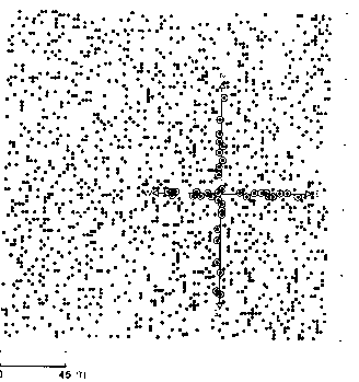 Les stations du "transect" sont constituées de 1O arbres échantillons, choisis les plus voisins du point défini par arpentage; elles sont distantes les unes des autres de 1OO m. Cette configuration répond à des objectifsde simplification du repérage et du balisage, à des exigences de rapidité de parcours du dispositif entier; de plus, le groupe de 1O arbres voisins correspond grosso-modo au "domaine d'une chenille" dans des conditions moyennes de densité, chacun des 1O arbres risquant d'influer sur une chenille née sur l'un d'entre eux.