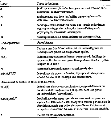 La qualité du feuillage est repérée par la proportion dans la frondaison de catégories faciles à distinguer. Les notations ont été mises au point en 1975-1976 et sont propres à notre étude (FRAVAL et al., 1980); elles ne nécessitent aucun appareillage. La façon de procéder est décrite et illustrée d'exemples par FRAVAL (1986a).