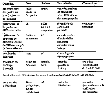 Les principales opérations de routine sur le terrain sont repertoriées dans le tableau VII et sont complétéespar un programme d'observations sur les chronologies du débourrement du Chêne-liège, des éclosions et des émergences de l'insecte, critères dont l'importance est apparue récemment.