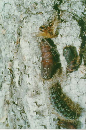 [sur la photo, de haut en bas : exuvie de la chenille, chrysalide